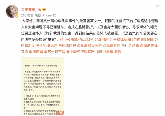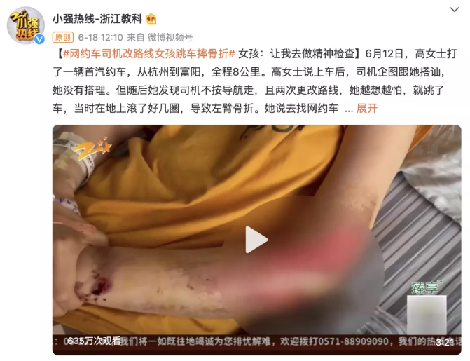 6月18日,浙江电视台教科影视频道《小强热线》栏目官方微博@小强热线-浙江教科发布视频并配文称:“6月12日,高女士打了一辆首汽约车,从杭州到富阳,全程8公里。高女士说上车后,司机企图跟她搭讪,她没有搭理。但随后她发现司机不按导航走,且两次更改路线,她越想越怕,就跳了车,当时在地上滚了好几圈,导致左臂骨折。她说去找网约车公司要说法,对方却让她去做精神检查。”