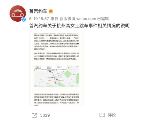 6月19日,首汽约车微博@首汽约车对此事发布情况说明:首汽约车对于司乘沟通不畅引发乘客误解,进而导致乘客高女士跳车受伤深表歉意。首汽约车表示,富阳区银湖派出所在调查取证后,初步认为该事件是由于司机与乘客双方沟通不畅而引起乘客误解,进而发生乘客选择跳车事件。根据行程录音,行程中无司乘争吵或其它明显声响,司乘双方全程语言交流很少,并未出现“司机搭讪”等内容。